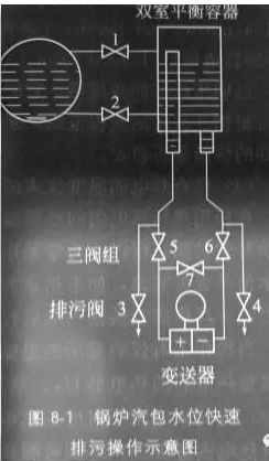 先關排污閥3,后關排污閥4,這樣雙室平衡容器正、負壓室及導壓管內都充滿了熱水;